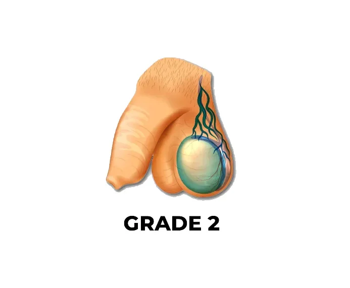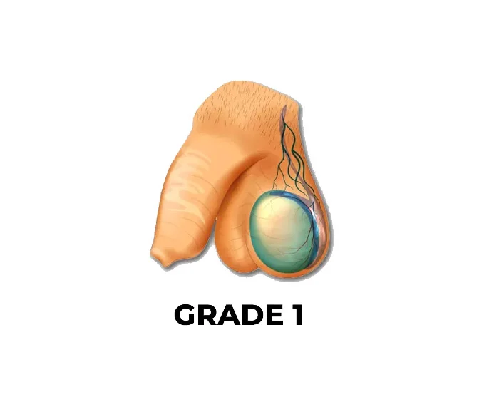 - The varicocele is not visible but can be felt during a physical exam when the patient is asked to bear down (Valsalva maneuver). It is the mildest form and often does not cause symptoms.